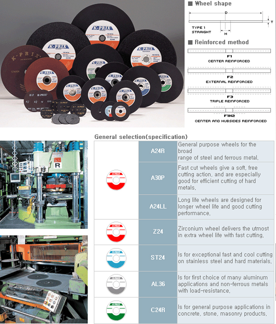 K-PRIX reinforced cut-off wheels are designed to easy performance, safety, low cost and ready availability for use with a wide range of ferrous and non-ferrous metal cutting applications such as bar stock, structural steel, tubing, sheet metal and etc. Reinforced cut-off wheels are used in all cutting operations where the work piece or the wheels is controlled by hand-held machines such as potable grinders, circular saws, chop saws, gas saws, stationary and swing flame cut-off machines.